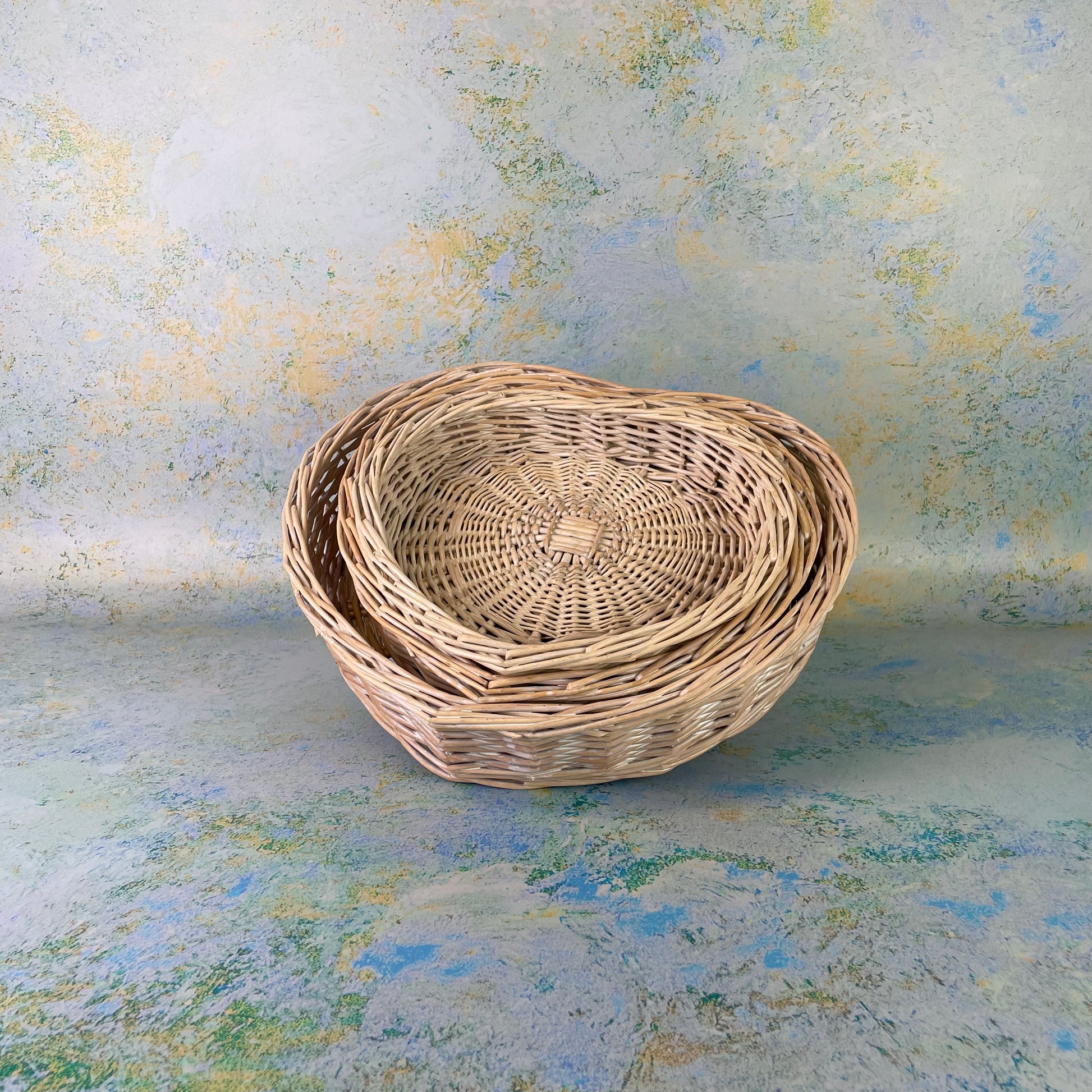 A delightful well made heart shaped wicker shallow baskets in a lovely rustic white wash wicker willow.